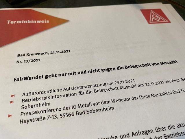 BAD SOBERNHEIM. Unruhe und Angst in der Belegschaft, Kurzarbeit, unklare Transformation: IG Metall mobilisiert die Belegschaft von Musashi.