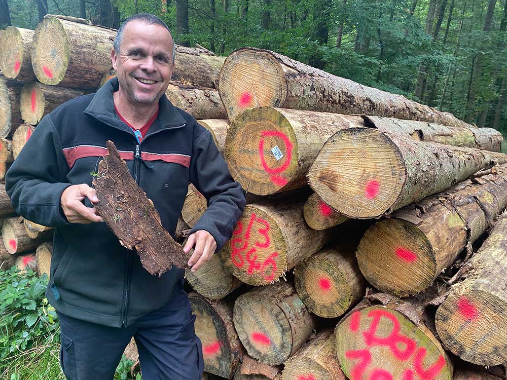 An diesen Fichtenstämmen hat sich der Borkenkäfer ausgetobt, zeigt Revierförster Frank Steines. Foto: Simone Mager